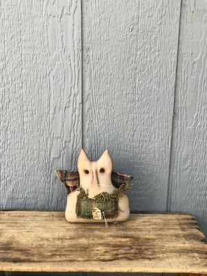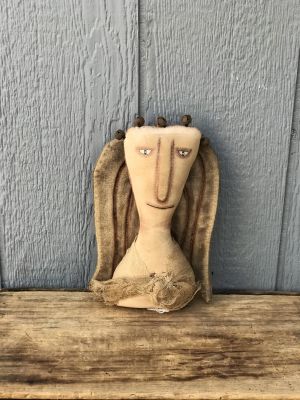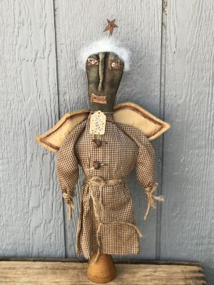 18" tall on an old bobbin. Soft sculptured wings, homespun dress and rusty accents. Has grey wool hair and prim facial features.